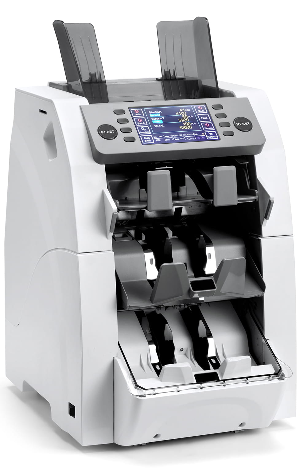 Odrzuca podejrzane/uszkodzone banknoty do osobnej kieszeni i pozwala liczyć dalej. W banku to klucz do utrzymania ciągłości pracy.