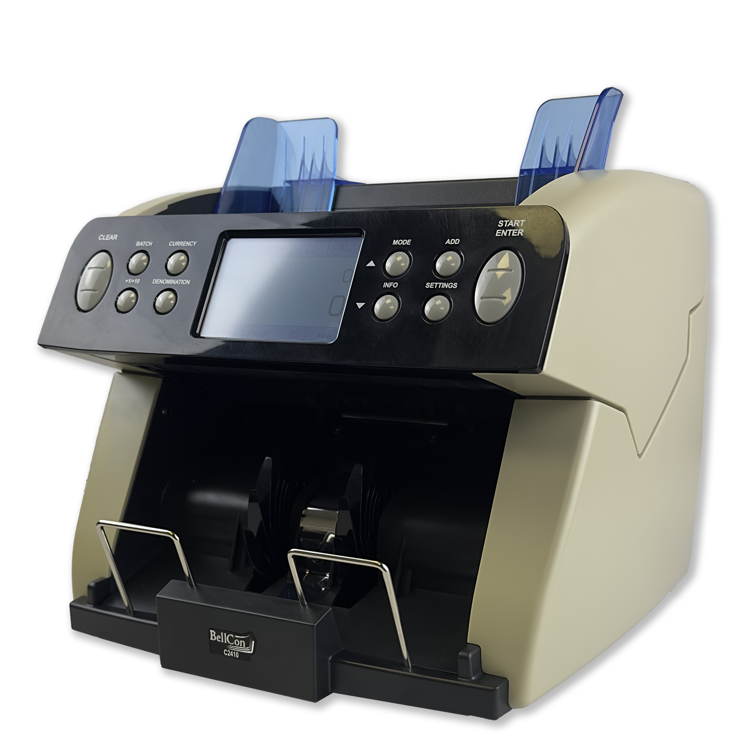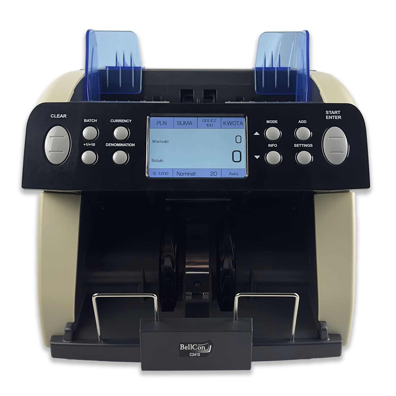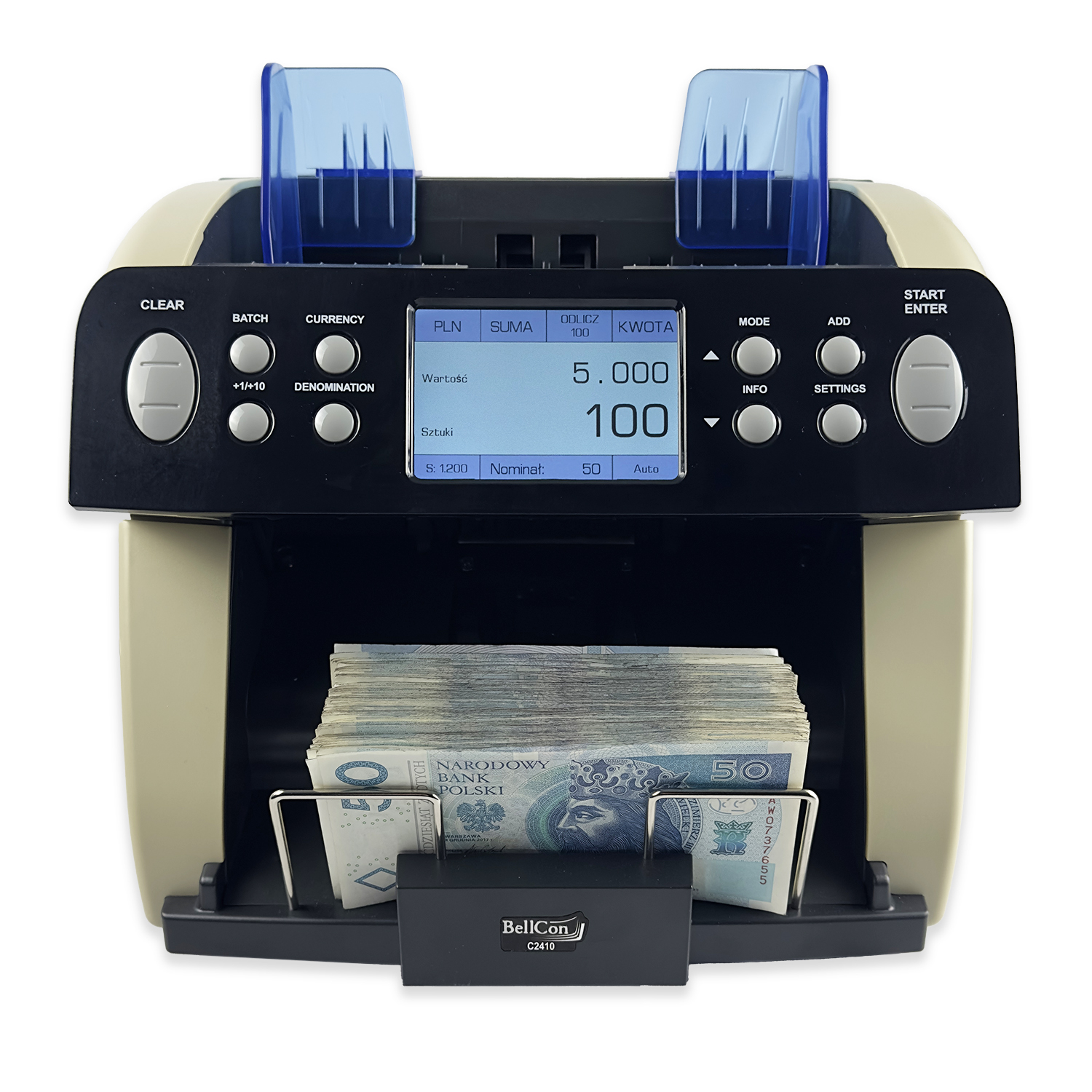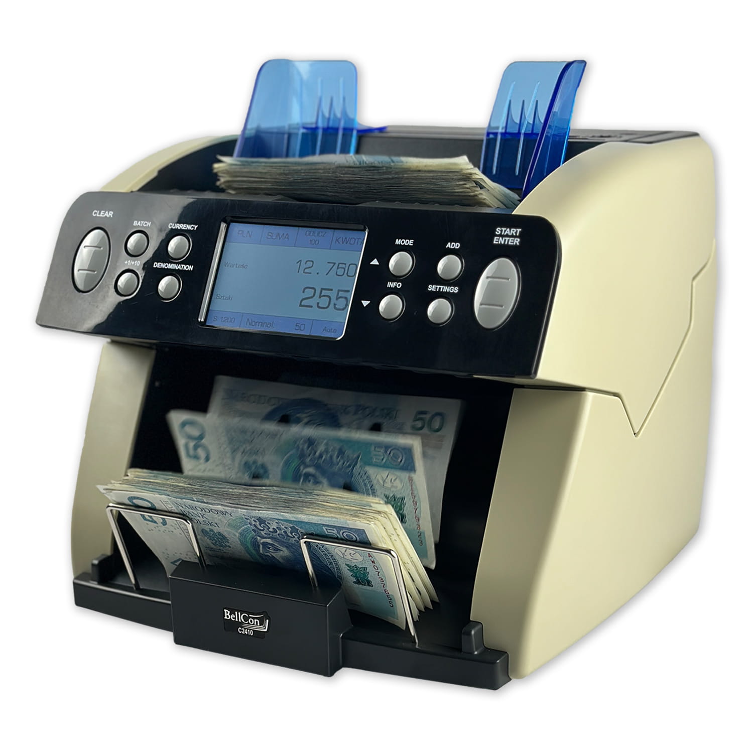 BellCon C2410 umożliwia półwartościowe liczenie banknotów – po wybraniu nominału urządzenie automatycznie oblicza łączną wartość przeliczonej partii. Możliwe jest również liczenie kilku różnych nominałów w jednym cyklu poprzez uruchomienie opcji sumowania oraz uzyskanie szczegółowego raportu z liczenia. Za bezpieczeństwo odpowiada rozbudowany system detekcji obejmujący czujniki magnetyczne, UV, grubości (czujnik niemechaniczny) oraz długości banknotów. Liczarka obsługuje do 40 walut i pozwala na łatwą aktualizację oprogramowania za pomocą pamięci USB, karty SD lub komputera. To niezawodne rozwiązanie dla banków, punktów kasowych i firm, które cenią szybkość, dokładność i komfort pracy.{col/50/}